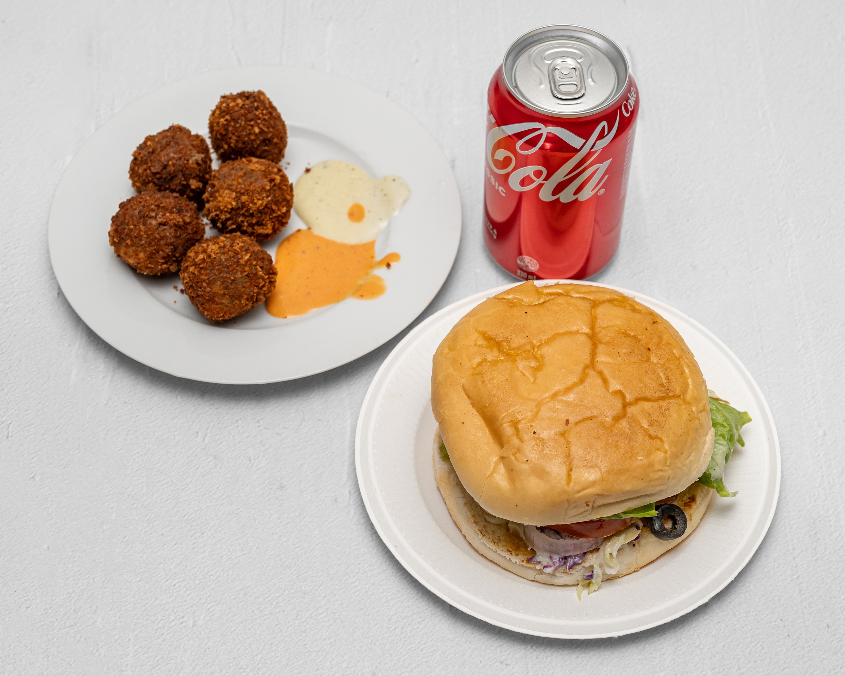 Mushrooms, red beans & potatoes patty, red onion, tomato, olives, cucumber, lettuce, salad, avocado mint sauce, cheese drizzle.