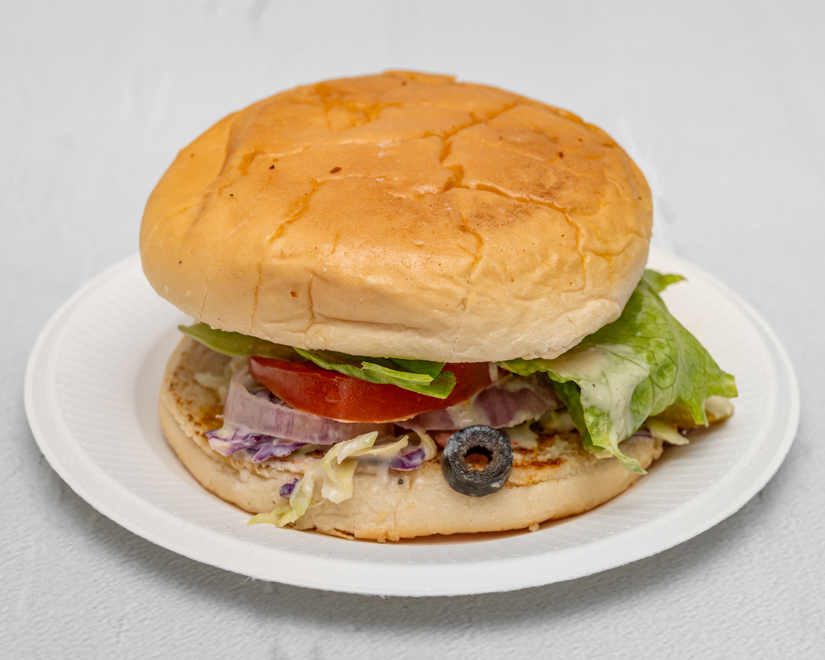 Rosted paneer, hung yogurt & chickpea patty, onion, tomatoes, jalapeños, olives, lettuce, salad, Avo mint zing, cheese drizzle.
